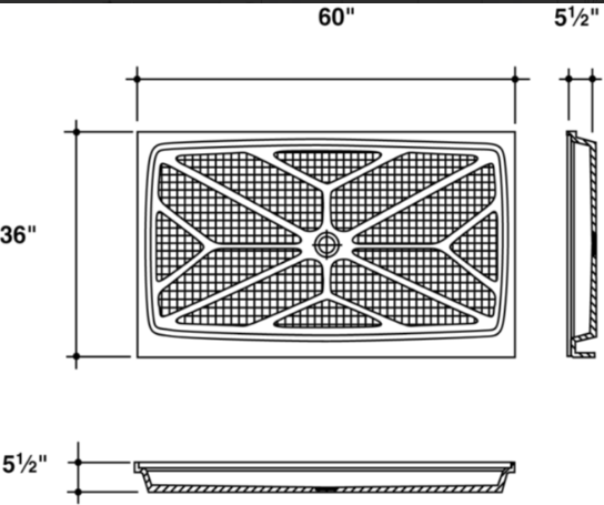 60”l | 36” w| Drain: 30”x17” |Threshold: Front: 60”